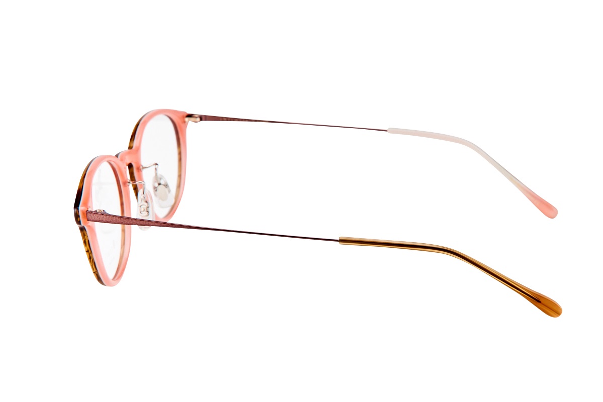 フロントとサイドの異素材感をブランド独自のカラーリングとジュエリーコンセプトのメタルパーツでバランス構築したモデル。βチタンテンプルによる軽さとしなやかさによりストレスレスな装用感を実現。