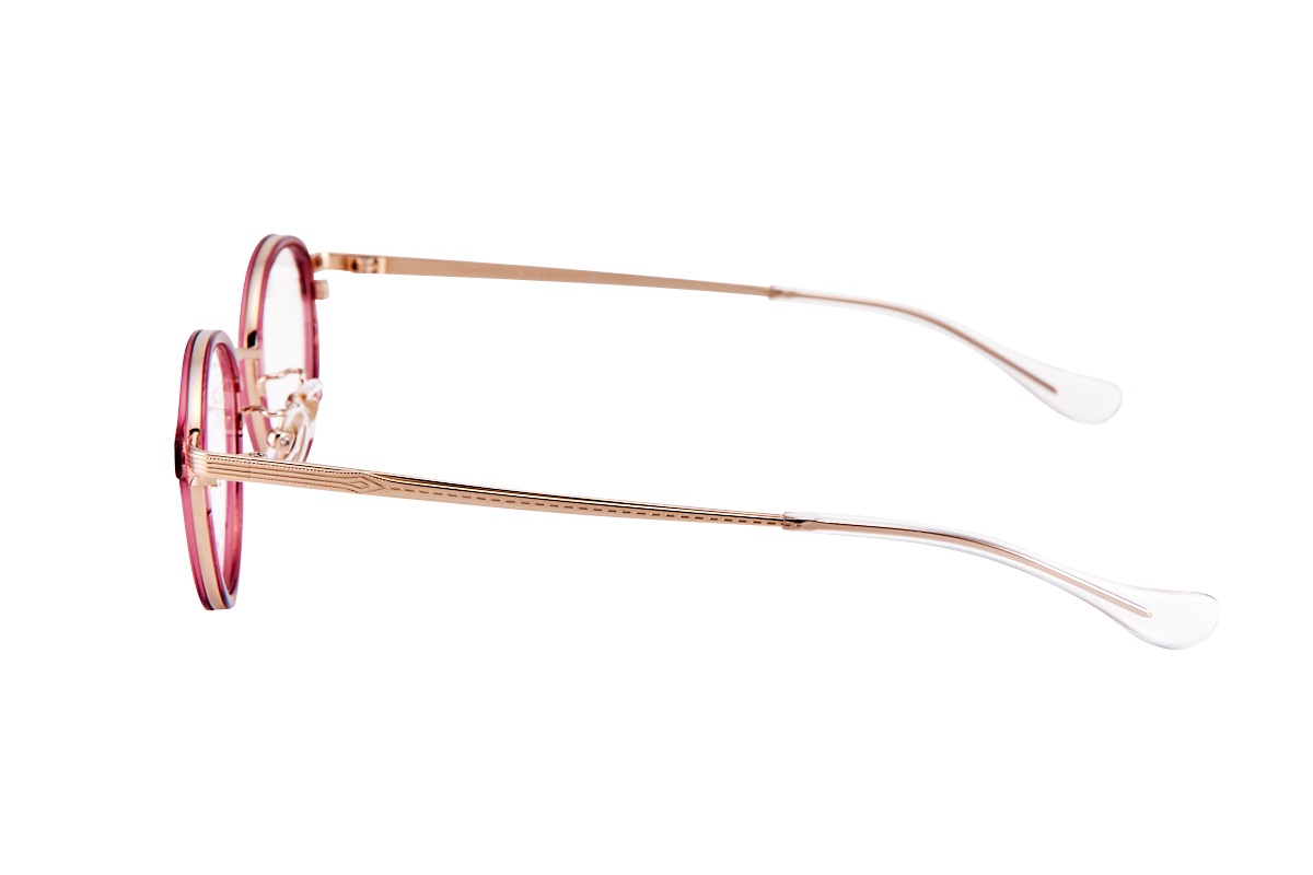 目尻がわずかに上がったボストンシェイプ。フロントは、メタルとプラスチックのインナーリムを組みわせたコンビネーション仕様。テンプルには繊細な彫金を施し、ディテールまで丁寧に仕上げています。