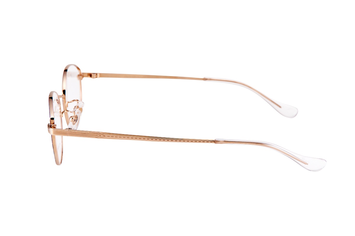 丸みを帯びたフォックスラインのフレーム。ゴールドカラーのメタルをベースに、リム表面には職人の手作業による七宝を配しています。テンプルは彫金入りデザインを採用し、透明モダンで引き立てた細部までこだわった作りです。