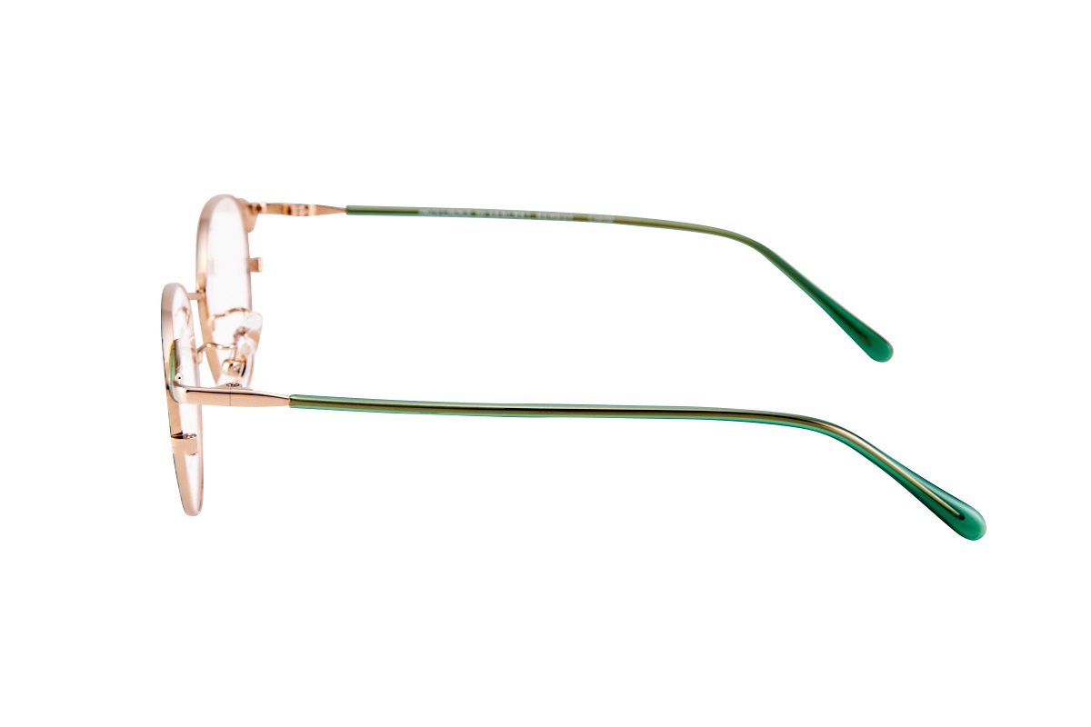 柔らかな印象のボストンシェイプに、目尻の盛り七宝がさりげないアクセントとなり、表情を明るく若々しくしてくれます。七宝と同系色のテンプルが、横顔に華やかさを添え、優しさと上品さを両立。顔なじみの良いカーキグリーンは明るく爽やかなイメージに。
